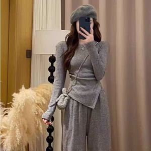 不规则纯色修身上衣女时尚百搭套装女春秋高腰阔腿长裤休闲两件套