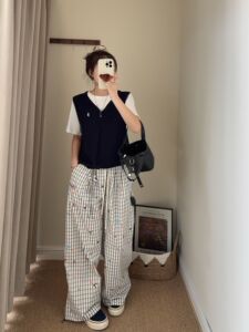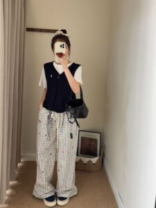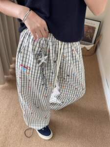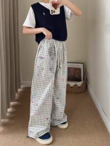 韩国东大门定制金属挂饰手绘星星格纹休闲裤女秋季新款宽松长裤