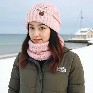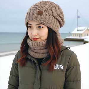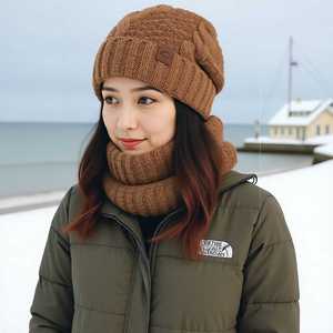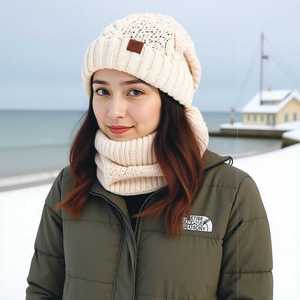 TEMU冬季欧美帽子围脖套装女士防寒保暖针织帽护耳套头毛线帽跨境