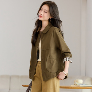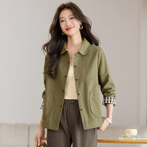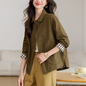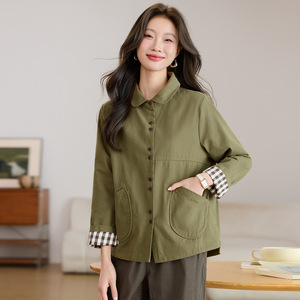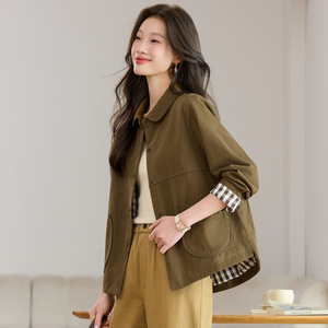 短外套女春秋2025新款中年气质妈妈休闲纯棉格子拼接初秋穿搭夹克