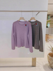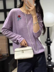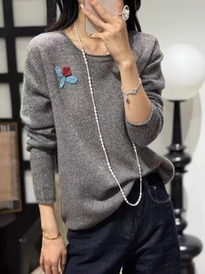 2025秋装新款圆领宽松立体玫瑰绣花羊毛针织衫女软糯舒适羊绒毛衣