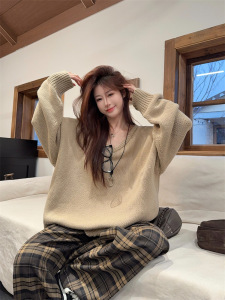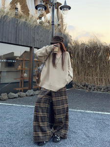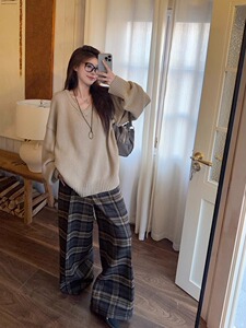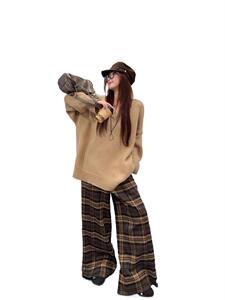 慵懒风套装宽松杏色针织衫女2025秋季新款复古格子阔腿长裤两件套
