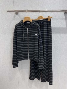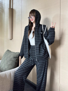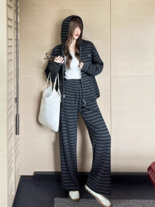 高品质miu家秋冬新款连帽条纹上衣+长裤两件套宽松休闲阔腿裤套装