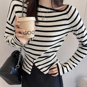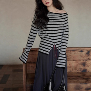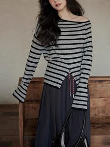 2025年秋季韩系开叉条纹一字领针织衫时髦套头毛衣修身高级感上衣