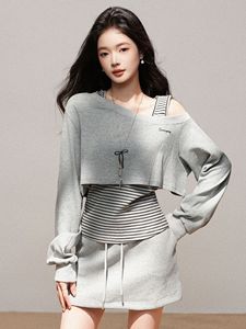 季优 斜肩刺绣长袖卫衣2025秋季新款条纹背心吊带两件套装女上衣