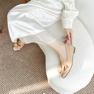 不累脚~5cm小个子内增高单鞋女蝴蝶结浅口芭蕾鞋配裙子裸色平底鞋
