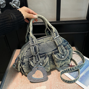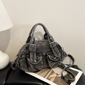 美式水洗牛仔多口袋单肩斜跨包设计大容量辣妹休闲复古小众手提包