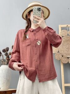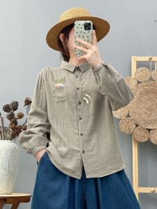 5546韩版狐狸刺绣双层棉纱长袖衬衫 女2025秋装新款宽松显瘦衬衣