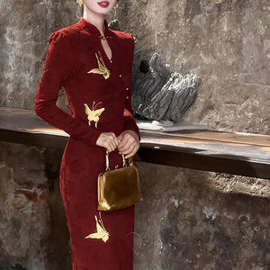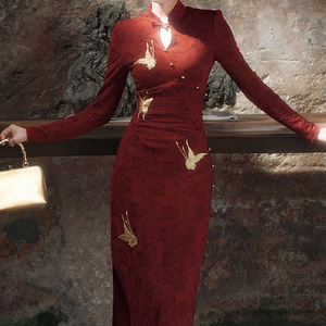 红色新中式改良旗袍裙子女2025早秋订婚长袖提花针织收腰连衣裙潮