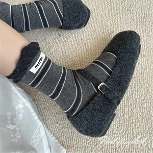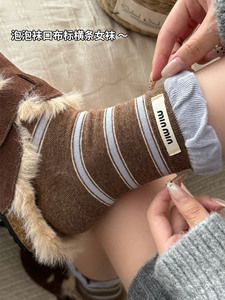 无骨条纹撞色双罗口布标字母ins潮袜韩系泡泡口棉miu系百搭中筒袜
