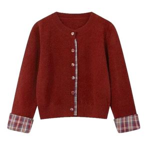假两件韩系圆领拼接格子毛衣女2025秋冬新款宽松休闲针织开衫上衣