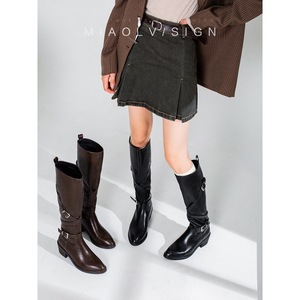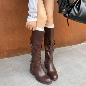 牛皮版长靴女秋冬复古靴子粗跟骑士靴箭头长筒靴交叉扣带高筒靴子