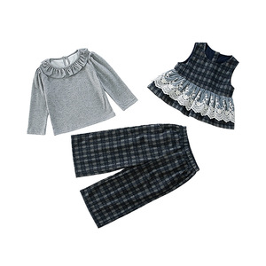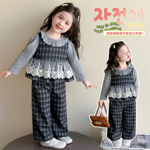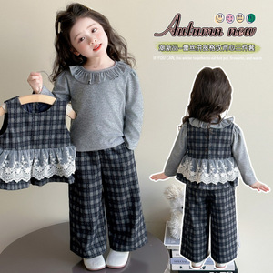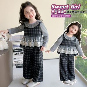 女童套装春秋款2025新款小女孩蕾丝花边马甲儿童宝宝秋装三件套潮