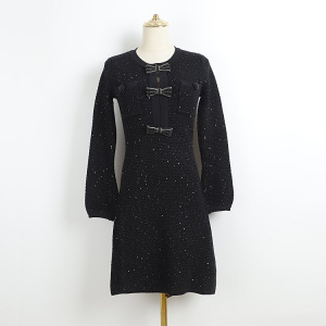 秋冬新珠片纱圆领连衣裙现货批发水钻蝴蝶结扣双口袋长袖中长裙子