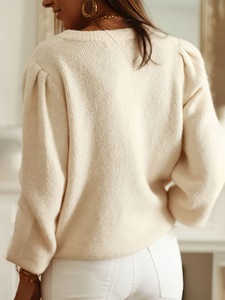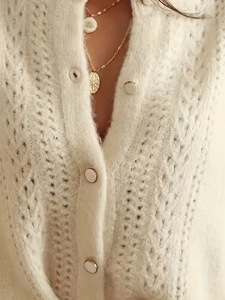 跨境秋冬新款纯色镂空V领开襟毛衣女欧美通勤百搭单排扣针织衫女
