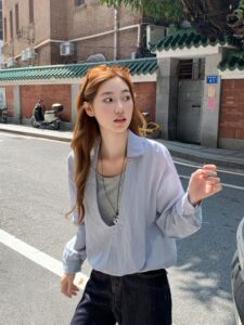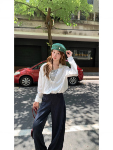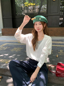 实拍百搭翻领长袖衬衫女早秋新款设计高级感宽松短款假两件上衣