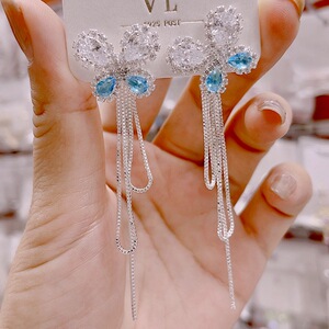 蓝色蝴蝶后挂式流苏耳坠925银针