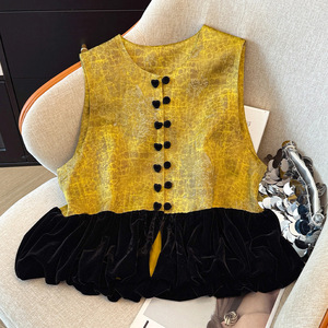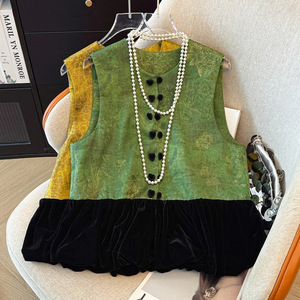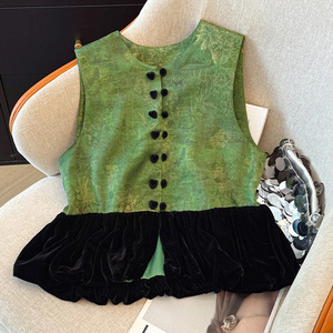 新中式国风丝绒拼接绿色马甲背心女装2025秋季新款复古高级感上衣