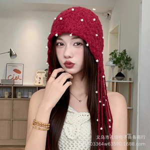 2025新款红色民族风钉珠流苏护耳帽子女秋冬加厚保暖显脸小套头帽