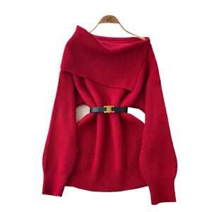 女神范感毛衣2025冬腰带时尚收腰百搭一字肩翻领显瘦别致针织上衣