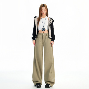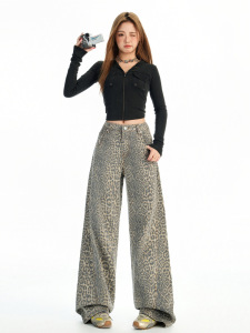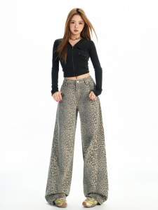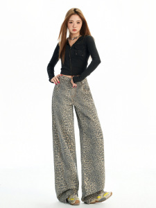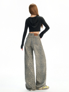 美式做旧豹纹牛仔裤女2025年秋季新款高腰设计感宽松直筒阔腿裤子