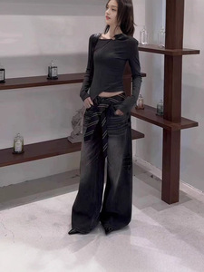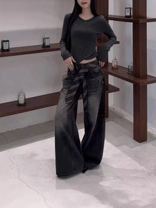不退换E66028港风个性复古水洗做旧阔腿牛仔裤女