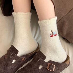 加绒加厚秋冬保暖蓄热刺绣暖绒女生中筒袜卡通少女可爱小狗睡眠袜