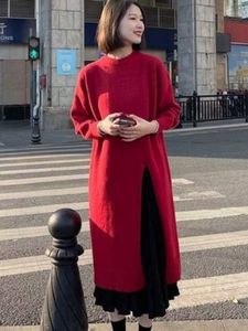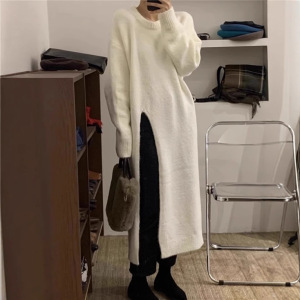 韩风chic设计感复古中长款毛衣长裙秋冬新款开叉圆领针织连衣裙潮