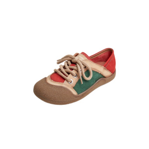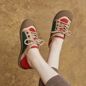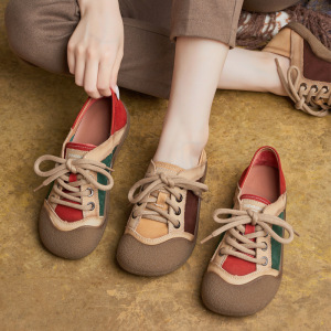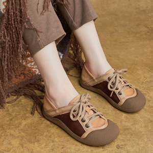2025年秋季新款圆头英伦风拼色真皮系带时尚休闲平底单鞋小皮鞋女