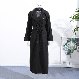 欧美跨境女装速卖通通勤气质翻领长款收腰系带经典款毛呢大衣外套