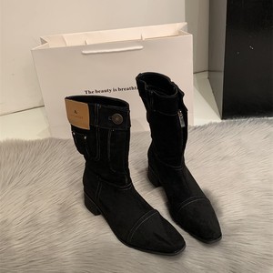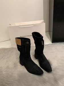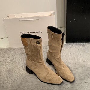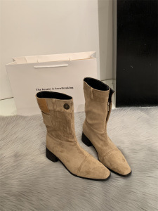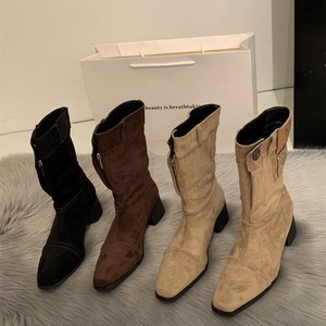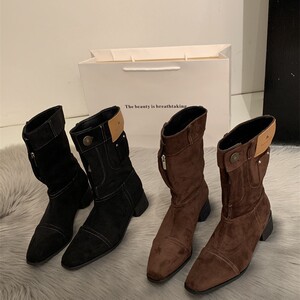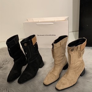粗跟马丁靴女高跟短靴2025秋冬季新款靴子法式绒面短筒靴方头女靴