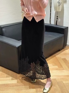 2025秋季新款欧货时尚百搭松紧腰蕾丝拼接醋酸丝绒绣花弹力半身裙