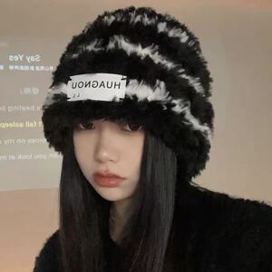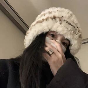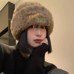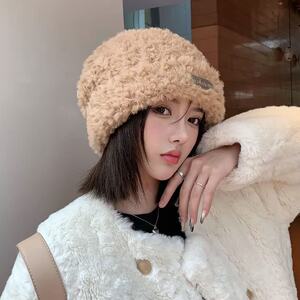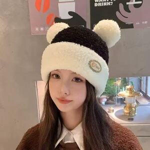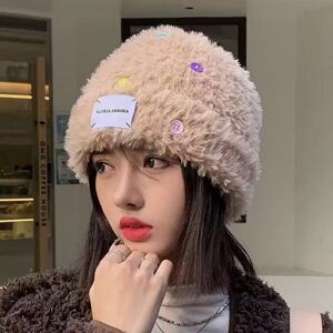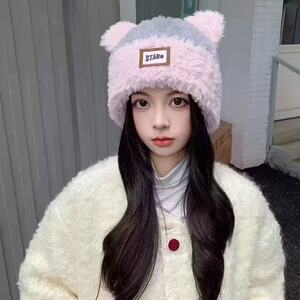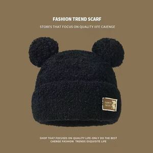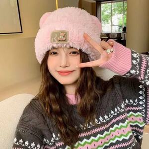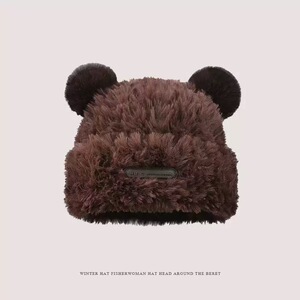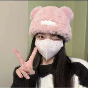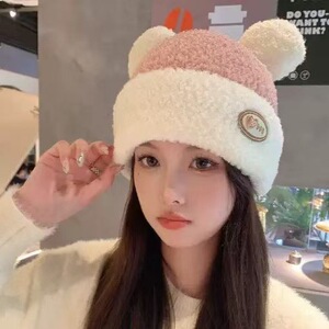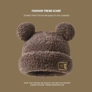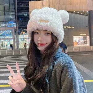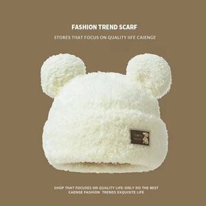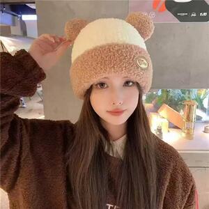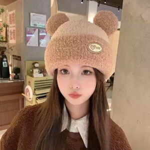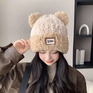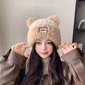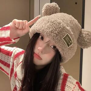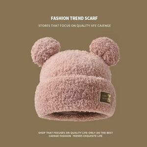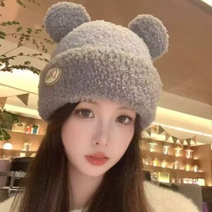 可爱小熊耳朵毛绒帽女冬季保暖大头围针织帽毛线帽百搭护耳显脸小