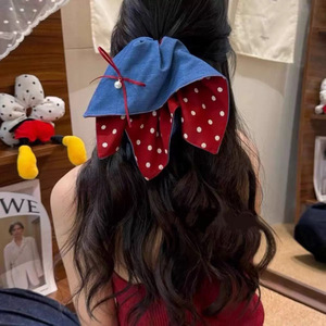韩系复古红色波点牛仔大肠发圈甜美百搭显白丸子头扎发头绳发饰女