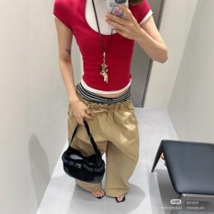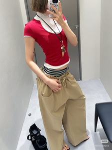 双腰头条纹拼接阔腿工装裤低腰松紧腰直筒长裤女 卡其/藏蓝