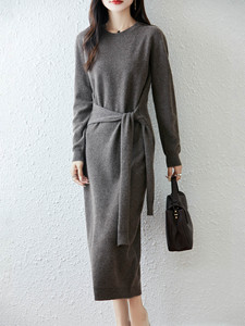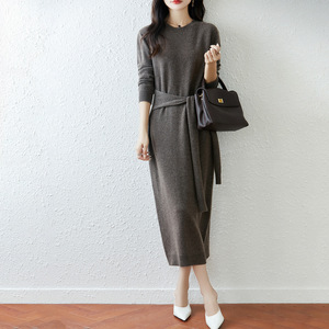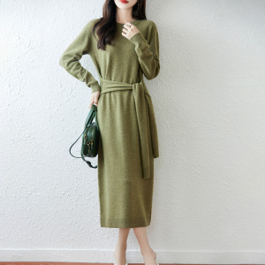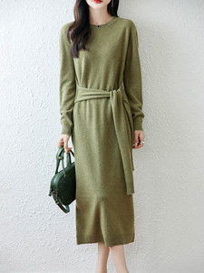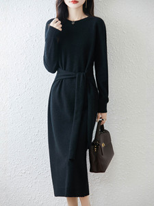 气质圆领100羊毛连衣裙女2025秋冬系腰带羊绒打底裙长款毛衣裙