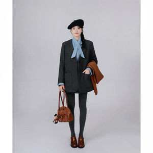 【叠穿少女】2025冬季新款韩版拼接复古外套A字短裙通勤两件套装-