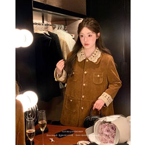杨小卷 MIU系复古翻领中长款麂皮/丝绒外套工装风衣女 美拉德穿搭