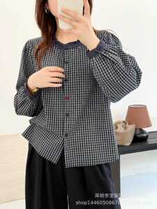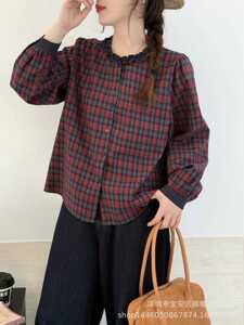 琪镌绘制秋季新款格子简约休闲宽松花边领女士单排扣开衫长袖衬衫
