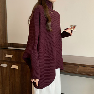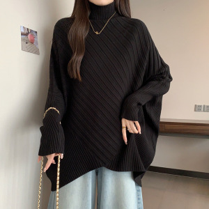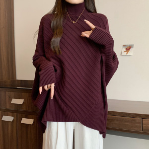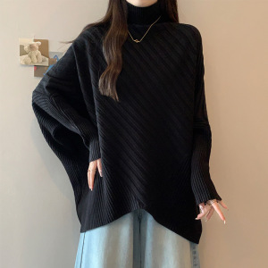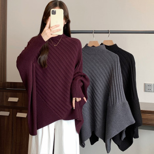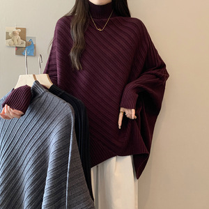 大码女装冬装新款胖mm气质半高领拼接斗篷蝙蝠袖加厚针织毛衣