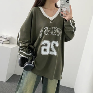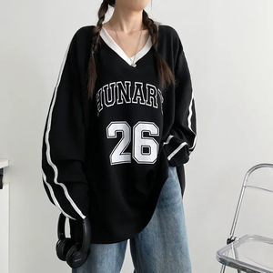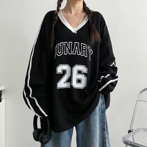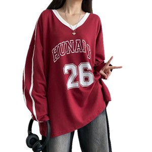 高级感宽松BF慵懒风长袖加绒上衣红色韩版大码V领卫衣女春秋薄款