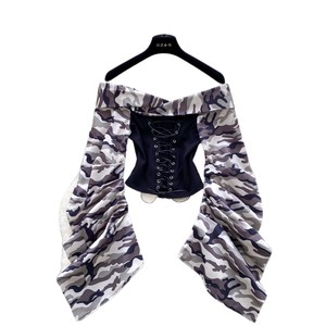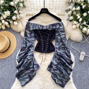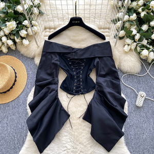 欧美女装2025秋季新款设计感绑带收腰一字肩褶皱长袖修身显瘦上衣