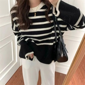 韩版条纹毛衣女慵懒风秋冬新款外搭开叉设计感撞色圆领套头针织衫