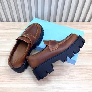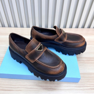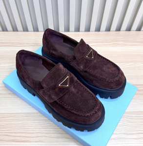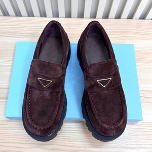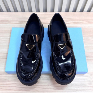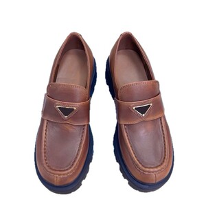 高定厚底三角标经典乐福鞋英伦风圆头浅口粗跟真皮一脚蹬小皮鞋女