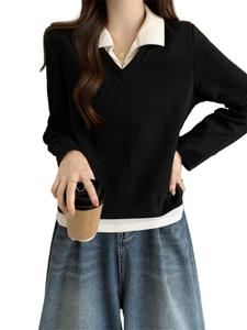 假两件polo领t恤长袖女秋季2025新款大码胖mm遮肚子显瘦正肩上衣