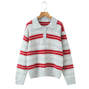 慵懒风POLO领撞色条纹针织衫2025秋季新款时尚宽松显瘦套头毛衣女