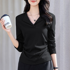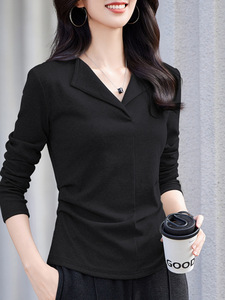纯色翻领长袖T恤女2025秋装新款气质抽褶显瘦内搭百搭上衣打底衫