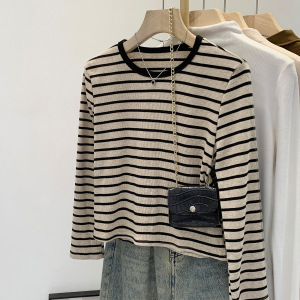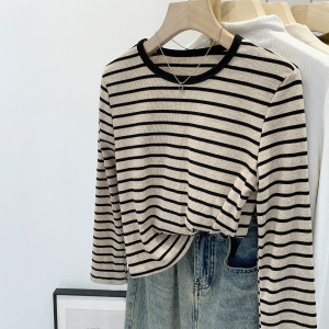 好美圆领长袖T恤女装潮韩版2025秋季新款设计感chic别致条纹上衣