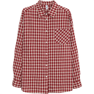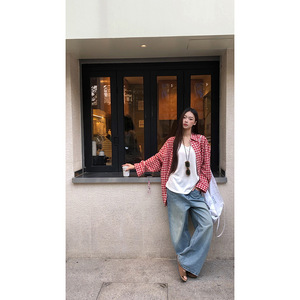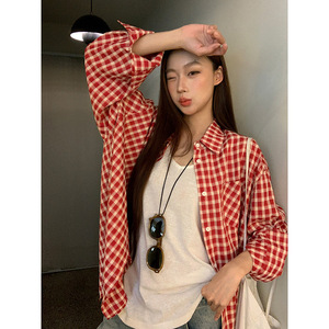 格子衬衫女2025新款爆款外套气质法式上衣长袖宽松红色衬衣