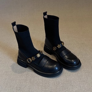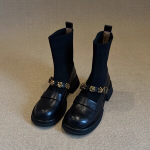 真皮版~厚底金属扣弹力短靴复古学院风针织瘦瘦靴女百搭乐福袜靴